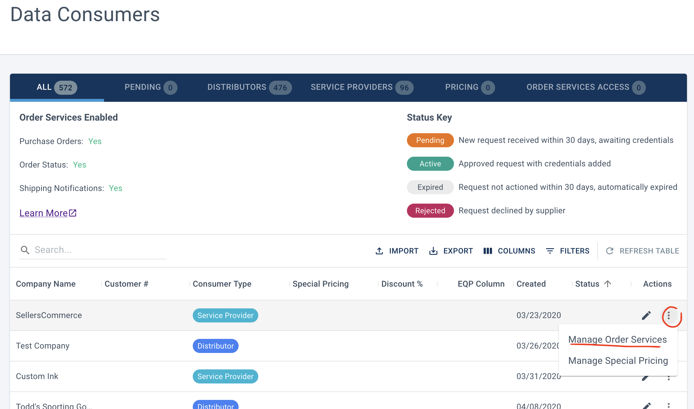 - On the Data Consumers page, click the three dot menu to the right of the distributor, then choos "Manage Order Services".